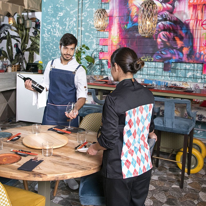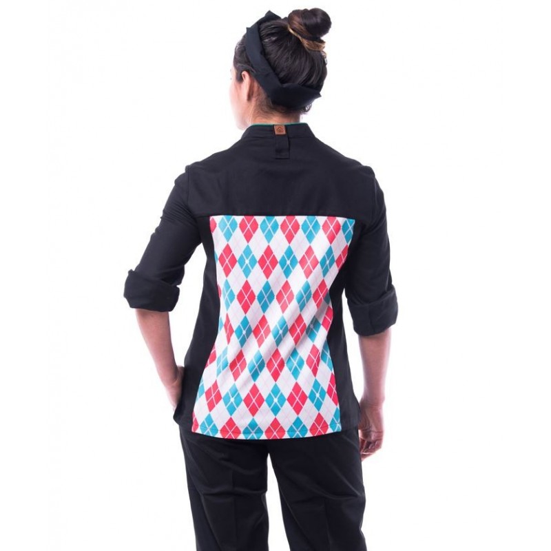 this fitted cook's jacket stands out with its printed back made from breathable technical fabric, ideal for offering comfort and style. Its design includes an elegant mao collar decorated with piping and long roll-up sleeves, giving it a sophisticated touch. The asymmetric closure with hidden press studs and the apron tie complete its functionality and aesthetics.
