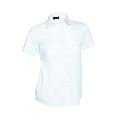Camisa entallada para mujer, de manga corta y cuello, ideal como blusa de vestir o uniforme para hostelería y servicios. Su tejido suave y transpirable la hace perfecta para verano, ofreciendo comodidad y estilo durante todo el día.