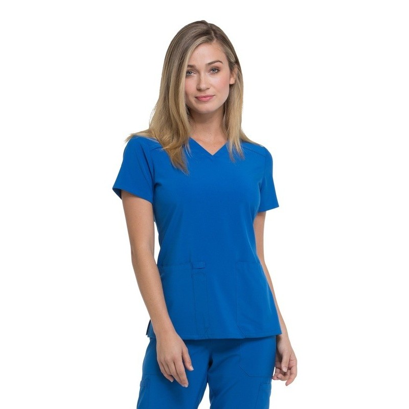 descubre la casaca dickies medical de mujer, diseñada con un corte entallado y cuello v para un estilo profesional. Con bolsillos de parche para un almacenamiento práctico y un tejido elástico bistretch para una comodidad total. Ideal para uniformes médicos.