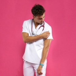 Scopri la giacca sanitaria per uomo più elastica e traspirante, progettata con tecnologia di ioni d'argento e tessuto antibatterico per offrire protezione e comfort ai professionisti della salute.