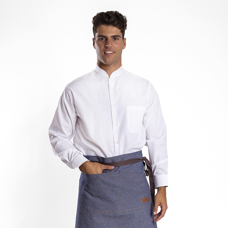 chemise classique pour homme avec col mao et manches longues, idéale pour l'hôtellerie et la restauration comme chemise de serveur ou chemise horeca. Offre un design intemporel et polyvalent avec une finition élégante, parfait pour diverses occasions.